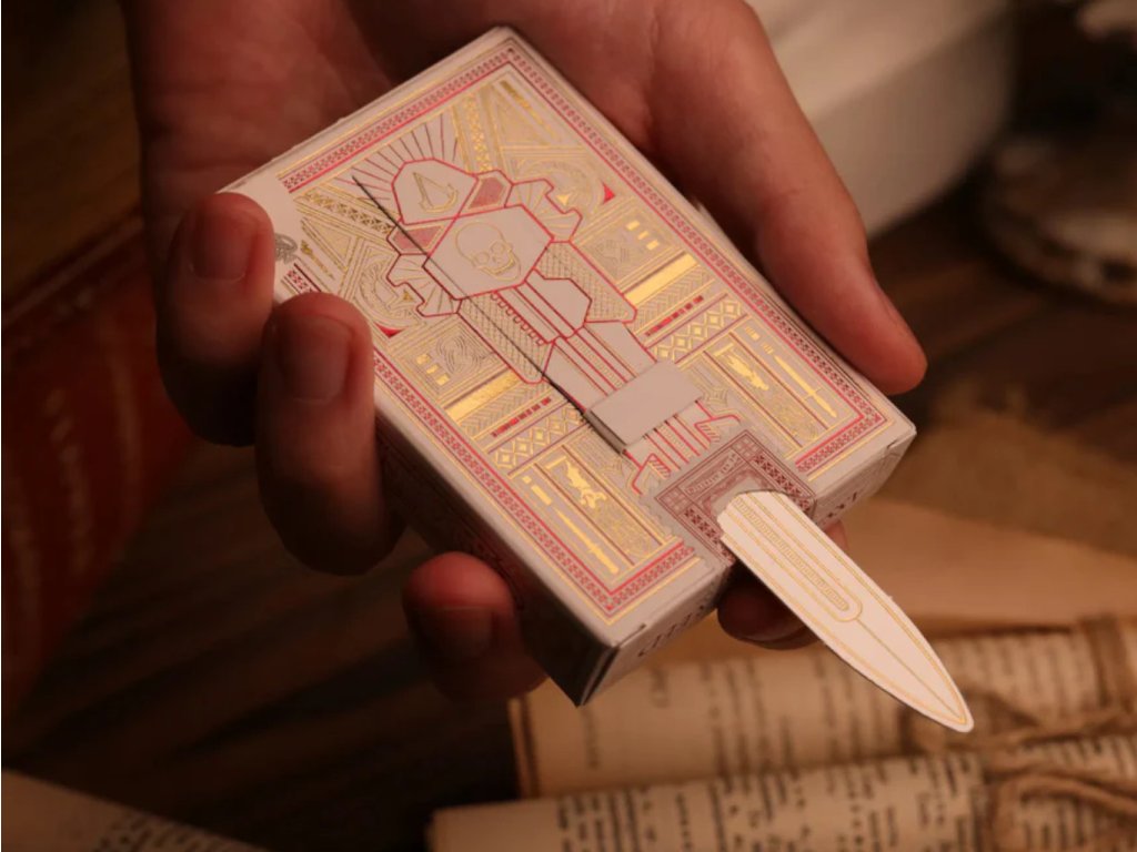 Bílá edice karet Assassin's Creed Playing Cards zaujme čepelí schovanou v krabičce.