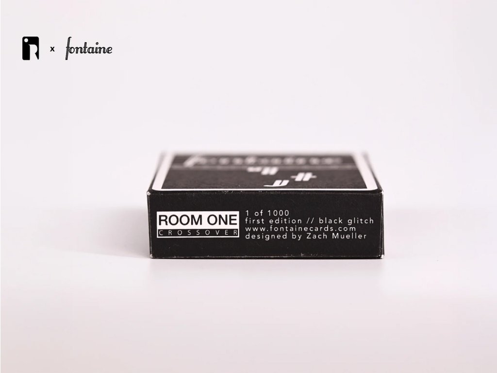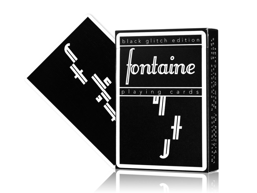 Karty Fontaine Glitch Black Playing Cards vytiskla společnost Room One na 270gsm Sleight stock. Karty mají standardní USPC líce s lehce pozměněnými barvami.