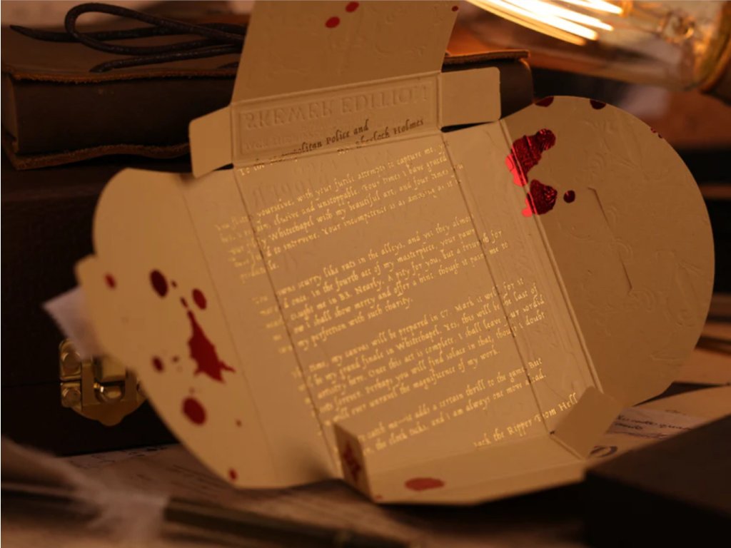 Tajemný zážitek, který se rozvíjí a je zapečetěn voskovým emblémem. Abyste se dostali ke kartám, musíte opatrně rozbalit krabičku a odhalit tak složitý design, který zachycuje podstatu napínavého pátrání detektiva.