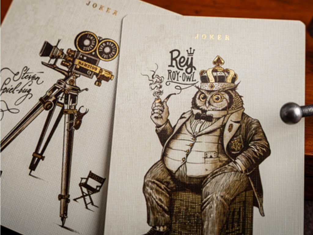 Skrze vyřezávanou krabičkou na vás pohlíží sova tvořící pikové eso tohoto balíčku.
