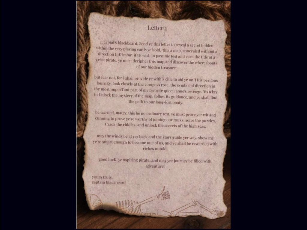 Balíček obsahuje básně vetkané do designu, které vedou hráče k odhalení skrytých detailů a symbolů. Rozluštěním těchto stop mohou hráči odemknout tajemství balíčku a odhalit konečný poklad. Tato hra promění standardní balíček karet v dobrodružnou cestu, která kombinuje vzrušení z hledání pokladu, historii pirátů a řešení hádanek pro poutavý a fascinující zážitek.