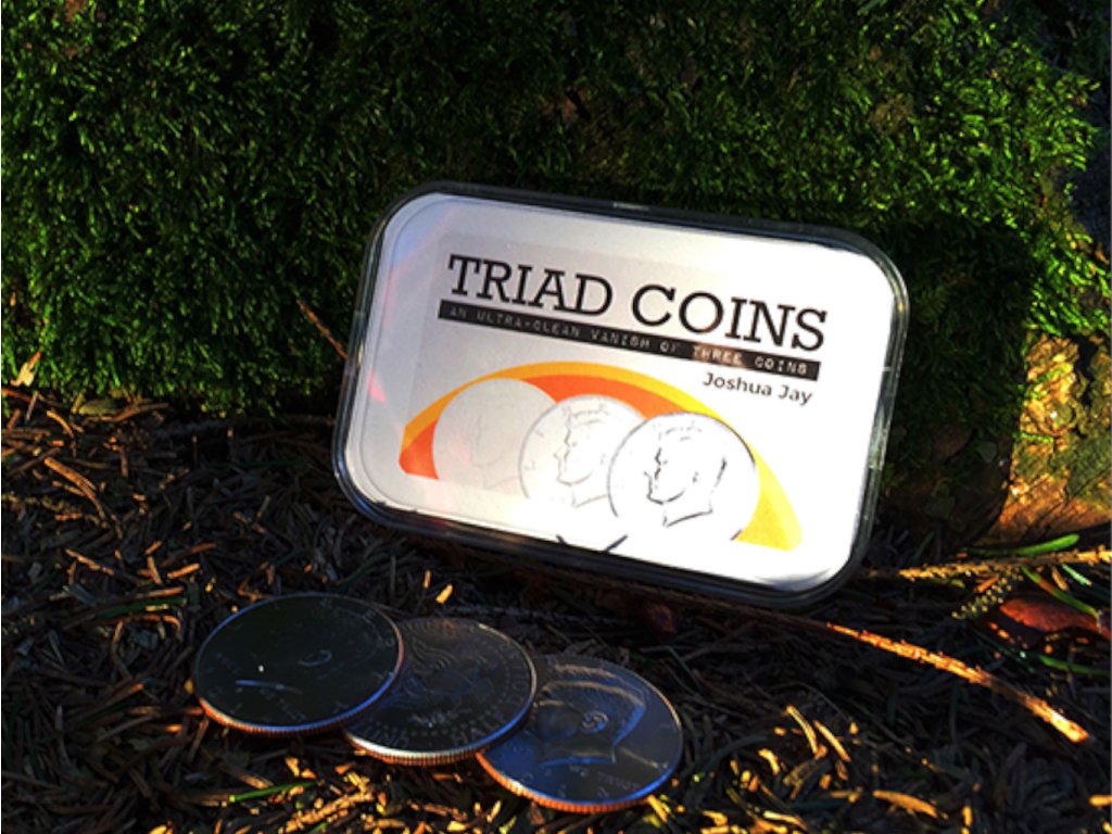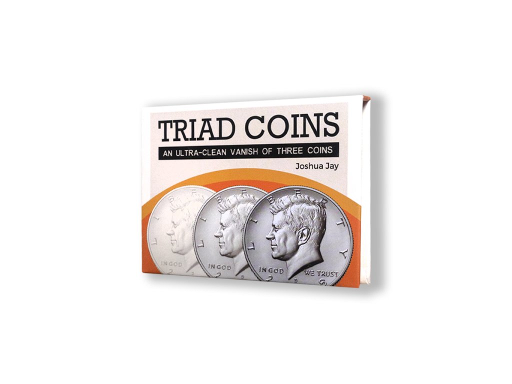 Triad Coins je kouzlo s mincemi. Nejdříve postupně objevíte trojici amerických půldolarů. Ty následně necháte jeden po druhém zmizet.
